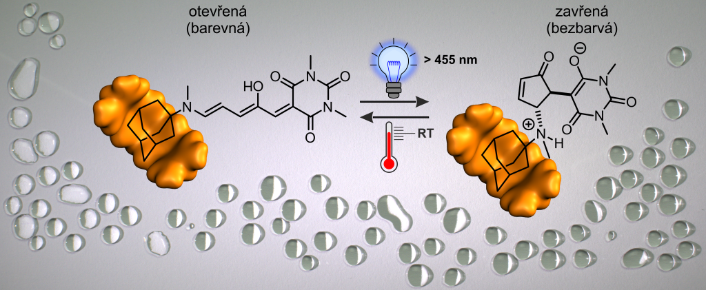 „Donorní část připravených DASA derivátů byla modifikována zavedením adamantylového motivu, na který se selektivně váže makrocyklická hostitelská molekula – v tomto případě cucurbituril. Tato interakce se ukázala jako klíčová pro opakované fotochemické přepínání systému ve vodném prostředí mezi dvěma formami – otevřenou (barevnou) a zavřenou (bezbarvou) – pomocí světla, podobně jako u vypínače“ dodává doc. Michal Rouchal, jeden z autorů práce.